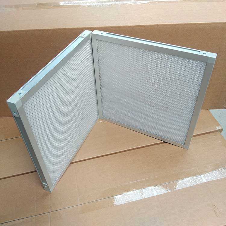 過濾材料是以折疊形式裝入高強度模切硬紙板內,迎風面積增大。流入的空氣中的塵埃粒子被過濾材料有效阻擋在褶與褶之間。潔凈空氣從另一面均勻流出,因此氣流通過過濾器是平緩和均勻的。視過濾材料不同,它所阻擋的粒徑從0.5μm到5μm而不同,過濾效率也不同 。