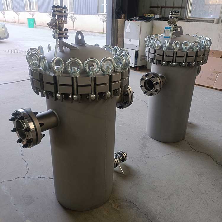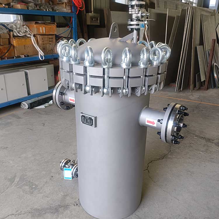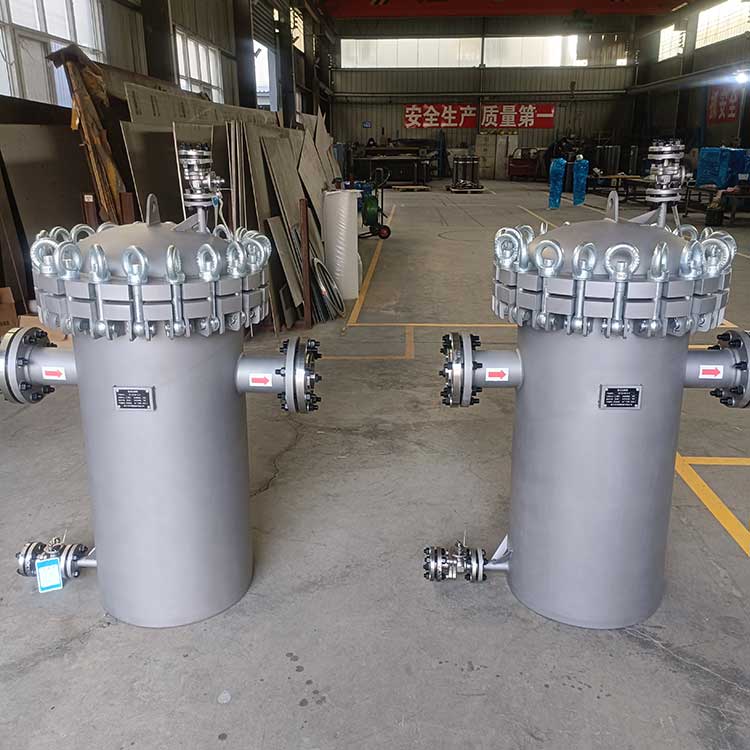 籃式過濾器主要由接管、筒體、濾籃、法蘭、法蘭蓋及緊固件等組成。當流體進入有一定規格的濾網的濾桶后,其雜質被阻擋,而清潔的濾液則由過濾器出口排出,當需要清洗時,只要將可拆卸的濾桶取出,處理后重新裝入即可,因此,使用維護極為方便?;@式過濾器具有結構簡便,阻力小,排污方便等特點。適用介質可為水、油、氣。一般通水網為18~30目,通氣網為40~100目,通油網為100~480目,可按用戶要求制作濾網,介質溫度:≤200℃。